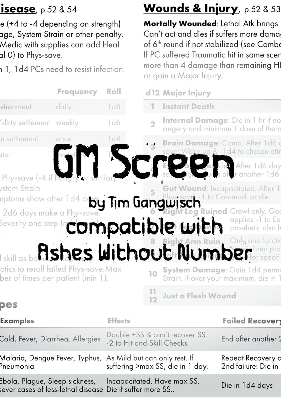 This unoffical GM Screen provides you with an easy-to-reference rules overview for the Post-Apocalypse game 'Ashes Without Number' by Kevin Crawford.